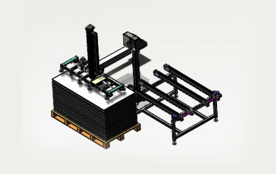 自動(dòng)排版機(jī)的主要功能單元有:玻璃輸送定位系統(tǒng)、抓取行走系統(tǒng)、視覺檢測系統(tǒng)、電控系統(tǒng)等;通過以上功能單元,實(shí)現(xiàn)了將自動(dòng)串焊機(jī)串焊好的電池串,按照工藝尺寸要求和排版方向順序自動(dòng)排版鋪設(shè)到玻璃(EVA已經(jīng)鋪設(shè))上,組成電池串陣列。玻璃/EVA通過傳輸線傳輸至指定位置,機(jī)械手抓取電池串實(shí)現(xiàn)CCD定位、自動(dòng)旋轉(zhuǎn)、自動(dòng)排版功能。設(shè)備通過同步帶傳輸與自動(dòng)生產(chǎn)線對接,實(shí)現(xiàn)了自動(dòng)流水作業(yè)。